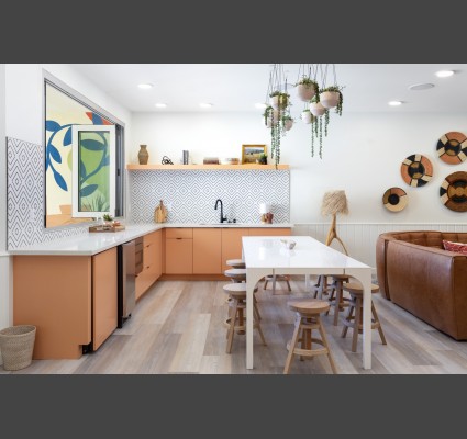 The project was designed by Summa Architecture. The project contains an indoor co-working space/business center, lounge area, and mail room. The resident clubhouse fronts and opens onto a large outside activity zone deck, which overlooks the adjacent creek and residential neighborhood, giving the resident the feeling of seclusion and separation. The activity centers are created to cater to the specific targeted resident profile for the project and are located on the 3,116 square foot outside deck. The deck will feature gaming activities like ping pong and corn hole, and have lounging/sunbathing areas, fire-pits and seating areas for outdoor co-working spaces, as well as outdoor dining and BBQ areas.